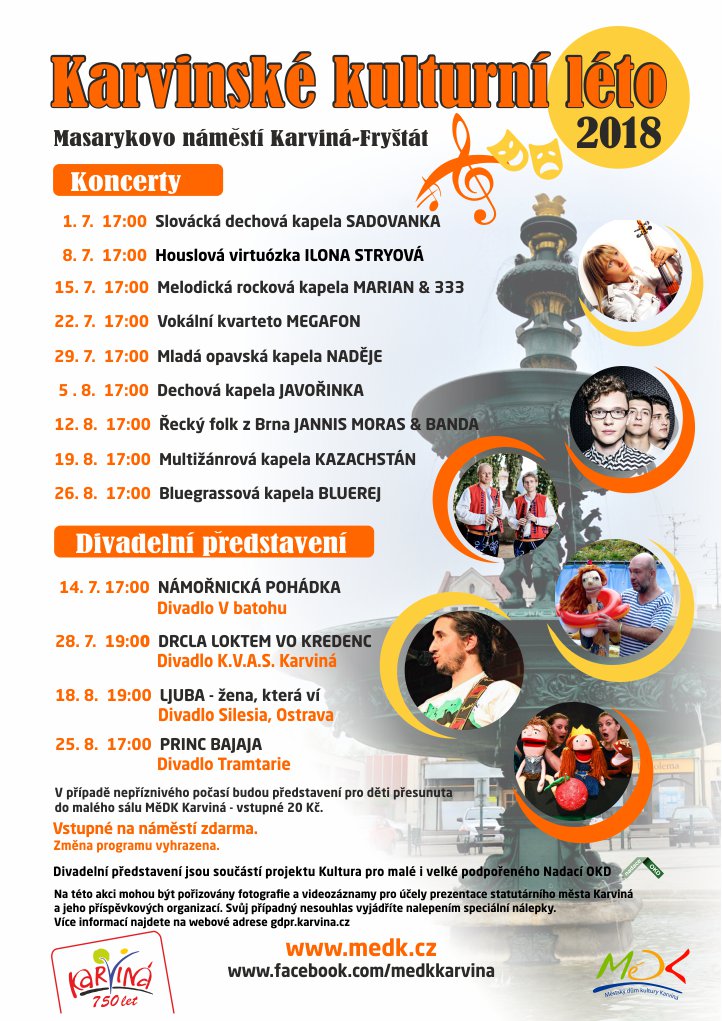 Karviná v létě žije kulturou. Každou prázdninovou neděli si na náměstí T. G. Masaryka v Karviné-Fryštátě můžete poslechnout množství pohodové hudby. Mimo koncerty jsou pro malé a velké diváky nachystány i divadelní představení.